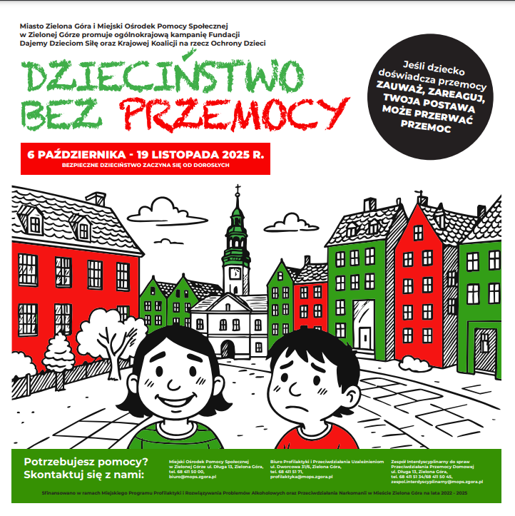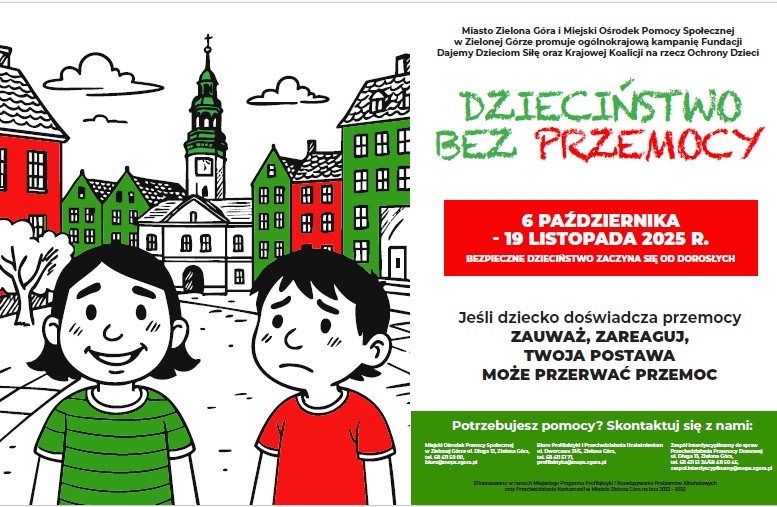 Akcja „Dzieciństwo bez przemocy” rozpocznie się 6 października 2025 r. W regionie pojawią się plakaty i ulotki z informacjami, gdzie szukać wsparcia, gdy dziecko doświadcza np. przemocy domowej lub rówieśniczej. Zostaną zorganizowane również inicjatywy edukacyjne.