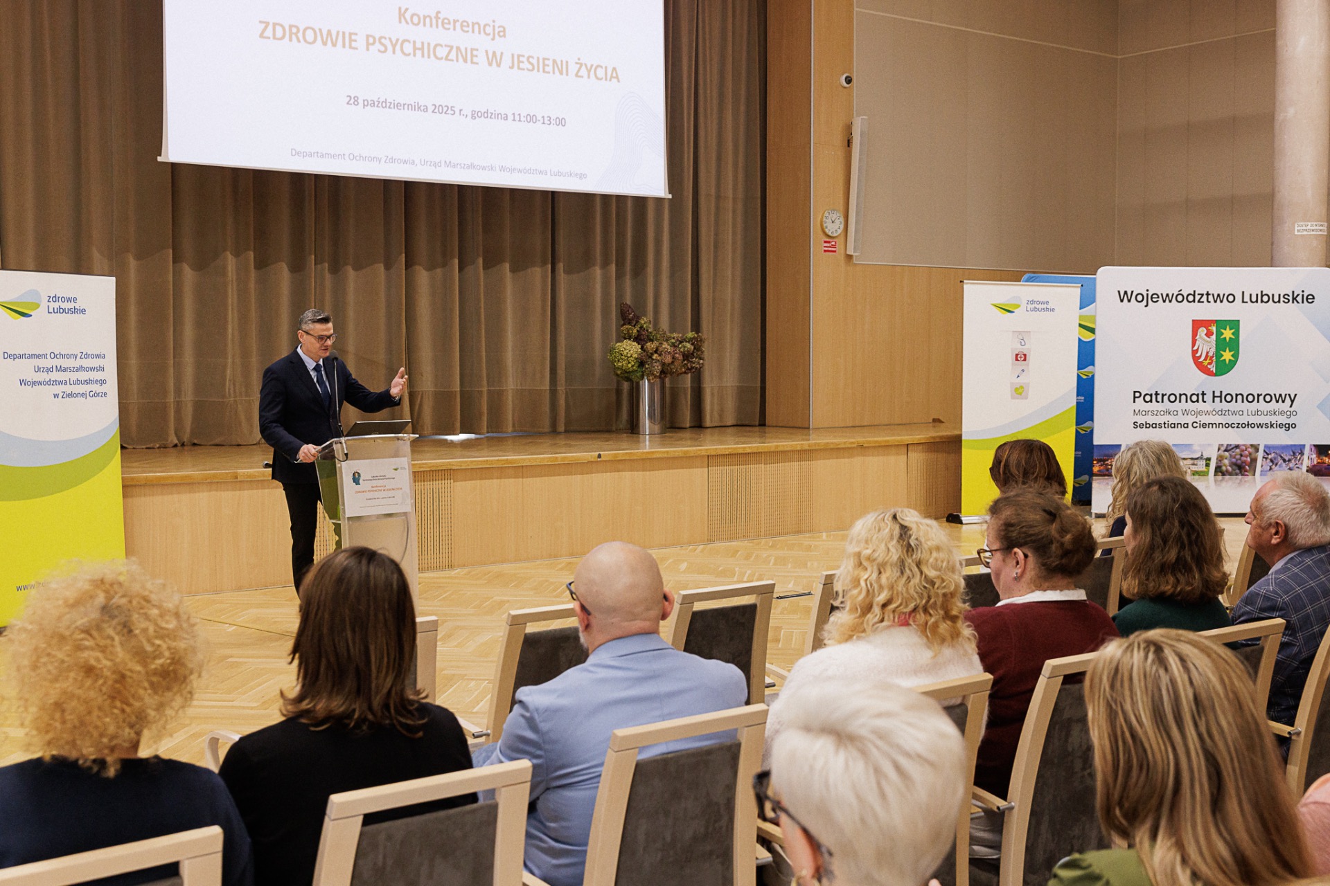 W spotkaniu, które odbyło się 28 października 2025 r. w Sali Kolumnowej Sejmiku Województwa Lubuskiego, wzięli udział nie tylko seniorzy, ale również prezesi i dyrektorzy lubuskich jednostek ochrony zdrowia oraz studenci pielęgniarstwa. – Nie ukrywam, że jestem pod ogromnym wrażeniem liczby uczestników konferencji. Cieszę się, że obecni są również ludzie młodzi. Mamy pewien dług wobec naszych rodziców, dziadków i pradziadków, bo dzięki nim jesteśmy na tym świecie, możemy realizować swoje plany, a kiedyś sami wkroczymy w tę jesień życia. Nie wiem, czy to dobre określenie, ponieważ gdy patrzę na osoby starsze, to często są one bardziej optymistyczne, aktywne i kreatywne niż osoby młode. Ale faktem jest, że osoby w jesieni życia wymagają szczególnego rodzaju wsparcia. Dziękuję naszym specjalistom, że pomagają nam obrać jak najlepsze kierunki tej pomocy – mówił na otwarciu spotkania marszałek województwa lubuskiego Sebastian Ciemnoczołowski.