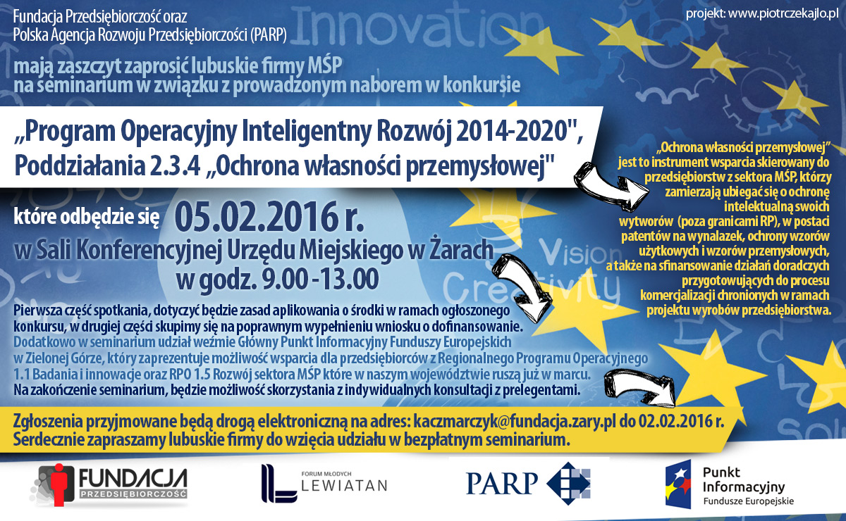 5 lutego w Żarach, odbędzie się seminarium w związku z ogłoszonym konkursem „Program Operacyjny Inteligentny Rozwój 2014-2020", Poddziałania 2.3.4 „Ochrona własności przemysłowej", które organizuje Fundacja ,,Przedsiębiorczość” we współpracy z Polską Agencją Rozwoju Przedsiębiorczości (PARP).